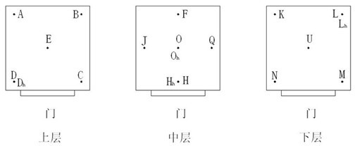 在被恒溫恒濕試驗(yàn)箱工作室內(nèi)定出上、中、下三個(gè)水平層面(簡稱上、中、下三層),上層與工作室頂面的距離是工作室高度的1/10,中層通過工作室?guī)缀沃行狞c(diǎn)O,下層在底層樣品架上方10mm處。 恒溫恒濕試驗(yàn)箱測量點(diǎn)分別位于上、中、下三層,如圖1和圖2。 溫度測量點(diǎn)用O、A、B、C、D、E、F、G、H、J、K、L、M、N、U表示。 相對濕度測量點(diǎn)用Oh、Dh、Hh、Lh表示。 工作室容積不大于2m3時(shí),溫度測量點(diǎn)為9個(gè),相對濕度測量點(diǎn)為3個(gè)