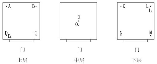 測量點(diǎn)O、Oh位于工作空間的幾何中心,其他各測量點(diǎn)與試驗(yàn)設(shè)備內(nèi)壁的距離為各自邊長的1/10,但不小于50mm。 工作室容積大于2m3時(shí),溫度測量點(diǎn)為15個(gè),相對濕度測量點(diǎn)為4個(gè),位置如圖2。 測量點(diǎn)E、O、Oh、U位于上、中、下層的幾何中心,其他各測量點(diǎn)與試驗(yàn)設(shè)備內(nèi)壁的距離為各自邊長的1/10,但不小于50mm。 若測出的工作空間的基本參數(shù)不符合GB/T 2423.3、 GB/T 2423.4、 GB 2423.9 、GB 2423.16的要求且與測量點(diǎn)的位置有關(guān)時(shí),可適當(dāng)放寬6.3和6.4規(guī)定的1/10的距離,但應(yīng)在檢定報(bào)告中予以記載。 當(dāng)恒溫恒濕試驗(yàn)箱工作室容積大于50m3時(shí),溫度測量點(diǎn)和相對濕度測量的數(shù)量可適當(dāng)增加。 |