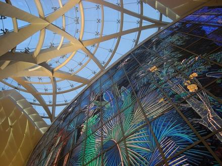 被切割開來(lái)的小玻璃,最后拼裝起來(lái),組成了《生命之源》。16米高的壁畫上,匯集了30萬(wàn)塊切割成各種形狀的小塊彩色玻璃。為了讓作品看起來(lái)更通透,彩色玻璃沒往墻上貼,而是貼在了半透明的無(wú)色玻璃上。