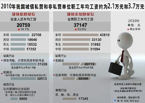 “五一”長假剛過,國家統(tǒng)計局就發(fā)布了2010年全國平均工資的主要情況。相對于去年3.3%的年度物價漲幅,中國的非私營和私營行業(yè)平均工資年度漲幅分別達到了13.5%和14.1%。 國家統(tǒng)計局的數(shù)據(jù)顯示,2010年全國城鎮(zhèn)非私營單位在崗職工年平均工資為37147元,比上年增長13.5%,增幅提高1.5個百分點。 同期,全國城鎮(zhèn)私營單位就業(yè)人員年平均工資為20759元,同比增長14.1%,增幅提高7.5個百分點。 中國的非私營單位主要包括股份制、外商投資、國有以及集體企業(yè)。 從地域分布來看,無論是城鎮(zhèn)非私營單位還是私營單位,在崗職工平均工資水平都呈東部最高、中部最低的情況。其中,城鎮(zhèn)非私營單位在崗職工年平均工資由高到低排列為東部、西部、東北和中部。上海、北京、西藏為全國非私營單位在崗職工年平均工資最高的三大地區(qū)。 若按行業(yè)分,金融行業(yè)依舊拔得包括非私營和私營在內(nèi)的各行業(yè)收入頭籌。 非私營單位中,年平均工資最高的三個行業(yè)分別是金融業(yè)80772元,是全國平均水平的2.2倍,超過了2009年2.1倍的水平;信息傳輸、計算機服務和軟件業(yè)66598元,是全國平均水平的1.8倍;科學研究、技術(shù)服務和地質(zhì)勘察業(yè)57316元,是全國平均水平的1.5倍。 而非私營單位年平均工資最低的三個行業(yè)分別是農(nóng)、林、牧、漁業(yè)(17345元),住宿和餐飲業(yè)(23812元),水利、環(huán)境和公共設施管理業(yè)(27229元)。最高行業(yè)與最低行業(yè)年平均工資之比為4.7∶1。記者發(fā)現(xiàn),這一比例與2009年持平. |