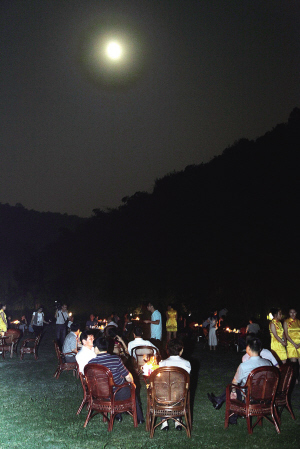 農(nóng)歷八月十六,中秋賞月好時節(jié)。昨晚,明亮皎潔的月光下,如毯的草坪上,支支搖曳的燭光點(diǎn)綴著南山的夜景。幾十張古典雅致的方桌椅,坐著來自社會各界的“見義勇為”代表、“大愛之星”代表、書畫文藝界精英、文明志愿者、風(fēng)景園林建設(shè)者、網(wǎng)民代表等近200人。大家相聚南山,聆聽山水的呼吸,放飛輕松的思緒,品茶、聽樂、寫詩、作畫,共享花好月圓的美好時刻。