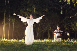 當(dāng)晚的南山賞月晚會沒有太多刺眼的燈光,也沒有喧囂的歌舞表演,取而代之的是古琴、簫、揚(yáng)琴、琵琶等民樂演奏。淡雅而纏綿的簫聲從遠(yuǎn)處隱隱傳來,溪邊涼亭內(nèi)身著古裝的文人雅士表演著圍棋對弈、書畫創(chuàng)作、詩詞朗誦等傳統(tǒng)的文化藝術(shù),營造出了溫馨、高雅,又富有望月抒懷情調(diào)的氛圍。