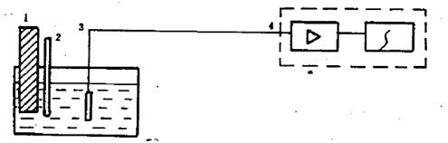 1:溫度控制儀、2:玻璃棒溫度計、3:溫度傳感器、4:數(shù)字電壓表(測量放大、自動顯示) 循環(huán)式恒溫水槽按圖4所表表示的方法,將溫度傳感器置于循環(huán)杯的幾何中心,進行15min的連續(xù)測試記錄。