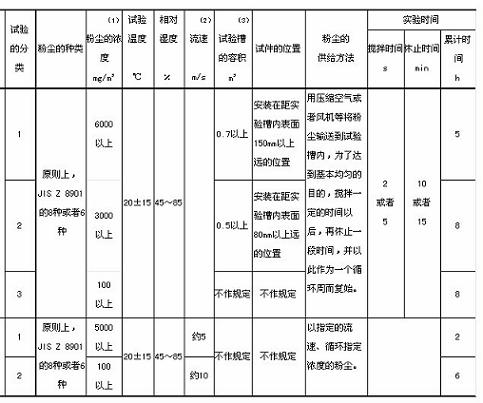 注 (1)所謂粉塵的“濃度”,是指粉塵在試驗(yàn)槽內(nèi)擴(kuò)散到基本穩(wěn)定狀態(tài)時的值。 (2)氣流的流速,在試件附近進(jìn)行測定。 (3)試驗(yàn)槽的容積規(guī)定為有效試驗(yàn)空間。