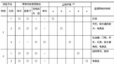 5. 適用基準(zhǔn) 塵埃試驗(yàn)的適用基準(zhǔn),按照零部件所處環(huán)境及零部件的使用部位進(jìn)行分類,原則上如表3所示。 附注 表中帶有圓圈符號“○”的欄目,表示適用的場合。 6、評價 按照“4.”進(jìn)行試驗(yàn),檢查零部件的品質(zhì)、性能以及粉塵的侵入程度。 JIS D 0207-1997 汽車零部件的防塵及耐塵試驗(yàn)通則解說