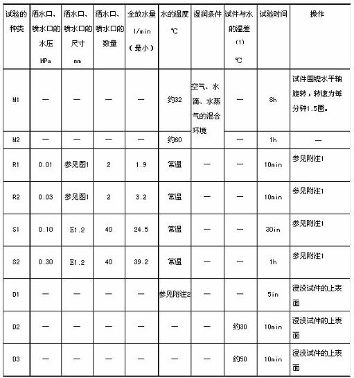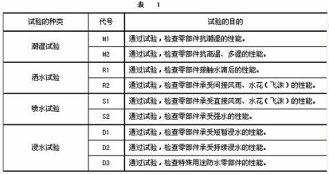 3、試驗方法  使用規(guī)定的試驗裝置,將試件按照正式使用狀態(tài)進(jìn)行安裝,以表2的試驗條件進(jìn)行試驗,檢查零部件的耐濕性、防水性、排水性,或者檢查零部件性能的變化情況等。